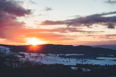 A panoramic view of a snowy meadow and mountains with dense forests at sunset against a partly cloudy sky in Slovakia