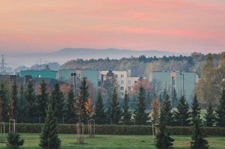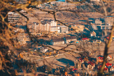 Horizontal shot of A shaped winter houses against trees and small houses on mountains during sunrise or sunset in countryside town named Limanowa in south Poland.