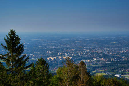 View on Krakow city landscape at the sunset from the Krakus (Krak) Mound in Poland. Tumulus, mythical resting place of Krakow's mythical founder, the legendary King Krakus.