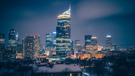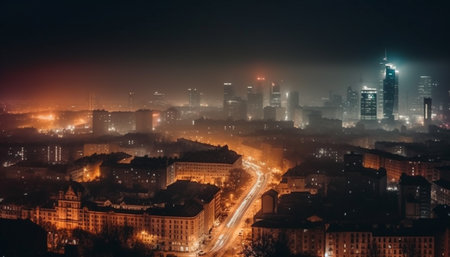 Nighttime cityscape: Skyscrapers illuminate urban skyline, a futuristic built structure generated by artificial intelligence