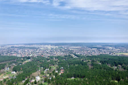 Czluchow, Pomeranian Voivodeship Poland - February, 26, 2021: Buildings of a small town - view from the tower. Residential houses in the center of a small town in Central Europe. Spring season.