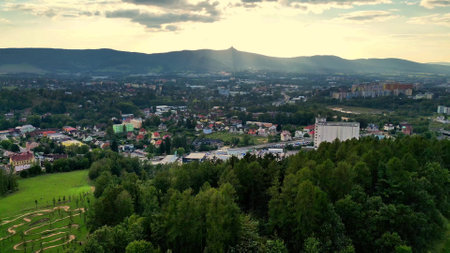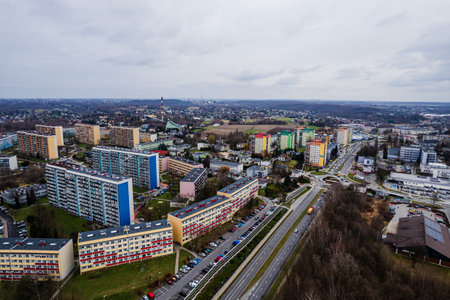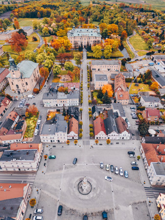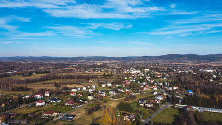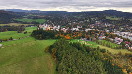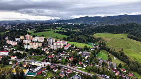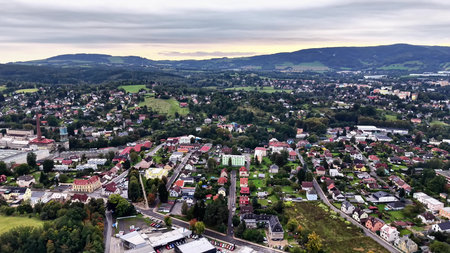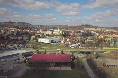Gorlice, Poland - 3 9 2019: Panorama of a small European medieval city at the present time. View from the drone or quadrocopter on the MOSiR sports complex and the historical center. Landscape Design.