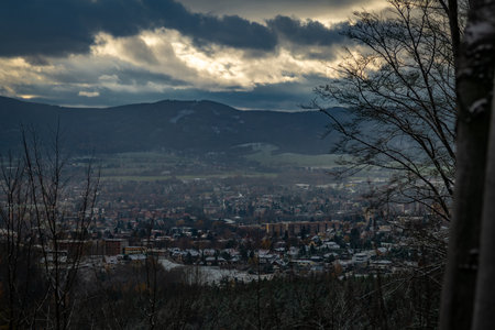 Landscape near Liberec city in Jizerske mountains in autumn snowy afternoon