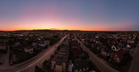 Calm district with houses, top view in sunset. Streets, parks and roads.
