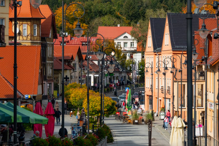 ZAKOPANE, POLAND - September 29, 2018: People on street for tourist walking and promenade in the city center in Zakopane in Poland