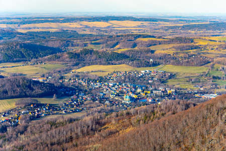 The view into the valley of the Zittau mountains from the castle Oybin to the little village Olbersdorf and at the very back of the valley the town Zittau.