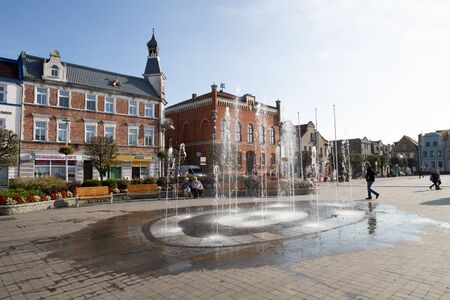 Puck, Pomorskie / Poland - October, 25, 2019: Market in a small fishing town in Central Europe. Old buildings in the city center. Autumn season.