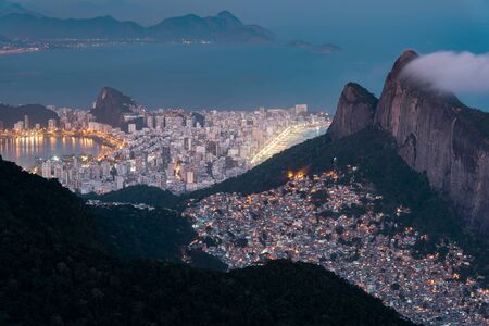 Aerial Night View of a Slum and Ipanema Neighborhood in Rio de Janeiro, Two Different Realities of Brazilian People