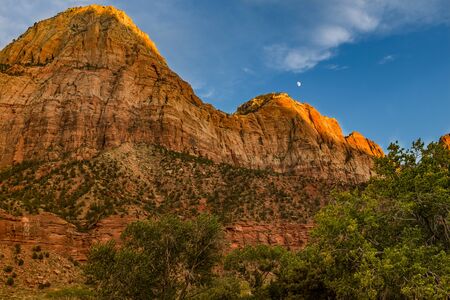 A landscape view of the amazing landscape from the canyon floor at Zion National Park, USA against a beautiful bright blue sky and moon in the distance nobody in the image