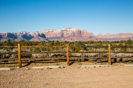 Wooden fence along the edge of an empty trailhead parking area in the desert of Southern Utah.