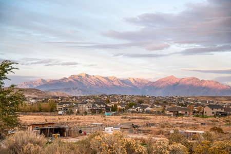 Salt Lake Valley and City panoramic views from the Red Butte Trail to the Living Room, Wasatch Front, Rocky Mountains in Utah early spring. Hiking view of trails around the University and Gardens and downtown. United States.