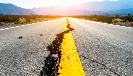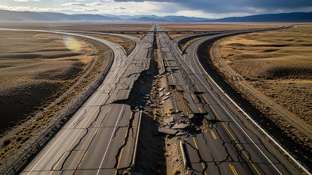 highway pavement buckled and broken from seismic activity, created with generative ai