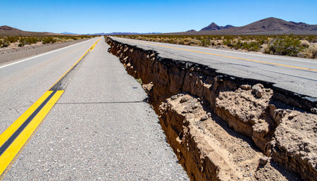 A deep crack splits a long desert highway, a stark reminder of a powerful disruption.