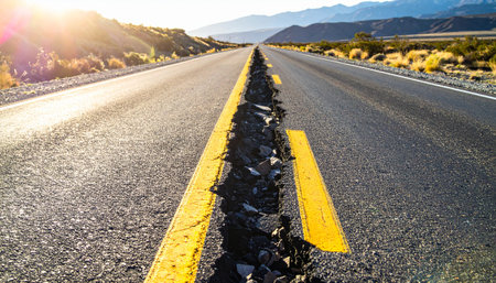 Captivating view of a cracked asphalt road with a dramatic landscape, showcasing sunlight over mountains and deep fissures, perfect for exploring nature's beauty.