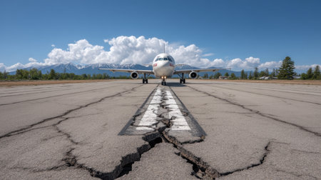 A large airplane sits on a cracked runway, showcasing a dramatic contrast with the mountains and clear blue sky above. This remote airport scene highlights nature and modernity.