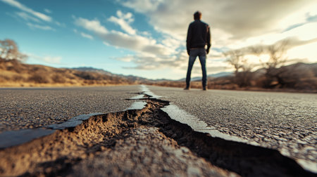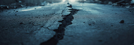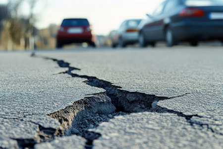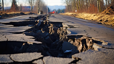 Deep cracks splitting asphalt roads after an earthquake, showcasing the immense power of seismic waves and the profound geological impact on the landscape