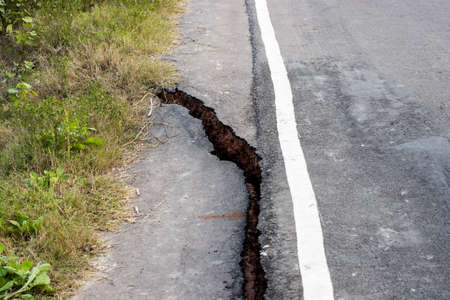 Consequences of a natural cataclysm of a landslide of soil, crack asphalt paving.
