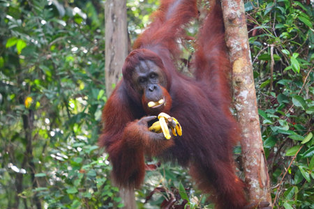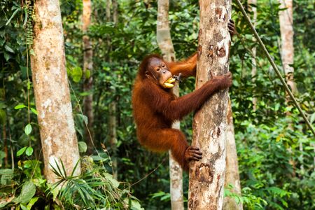 Young orangutan climbing up the tree while eating bananas in Borneo, Malaysia.