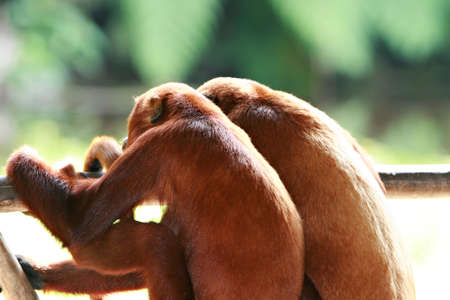 Thailand, Lop Buri - Little Orangutan sitting on the tree stump