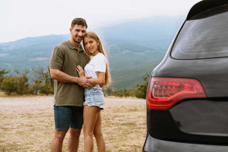 Man and Woman Sitting Inside Opened Trunk of Their SUV Car, Young Couple Enjoying Road Trip Along Sea at Sunset