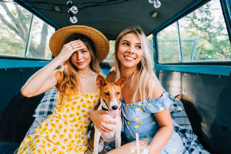 Portrait of two attractive cheerful woman sitting in a van with dog, enjoying summer vibes during road trip.