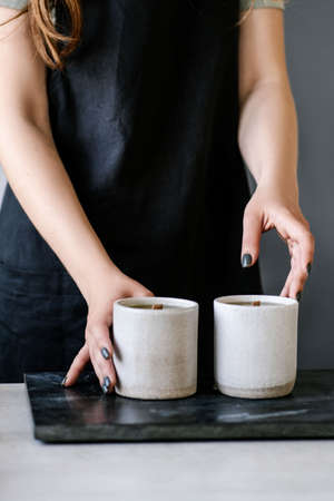 The close up picture of the person holding the cup of the coffee by their own hand to relax near fireplace for relaxation with dark gloomy blur background yet feel warm by the source of heat. AIG43.