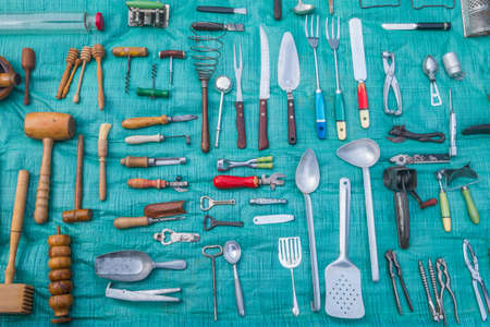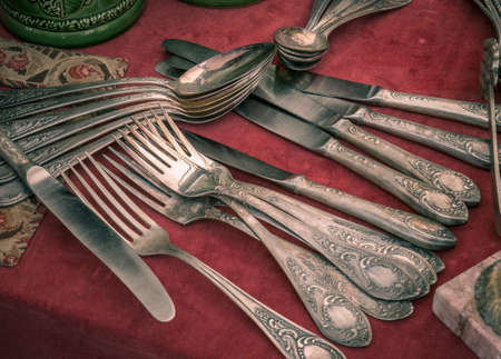 Old vintage cutlery on a red table. Vintage kitchen ustensils