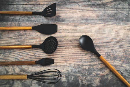 Studio photo of black plastic kitchen utensils, on the dark table.
