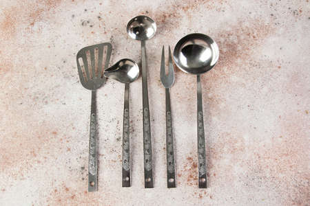 Vintage metal kitchen utensil on concrete background. Food photography props