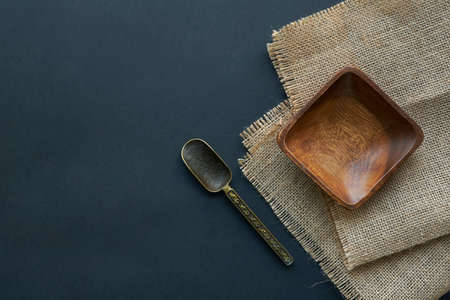 Wooden kitchenware on Natural pattern wood background. top view.