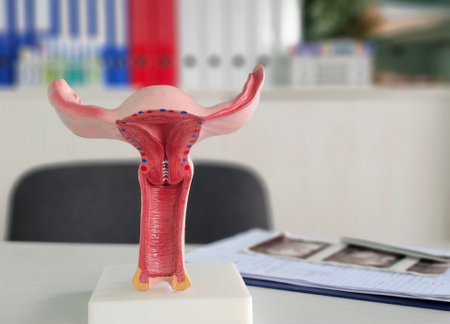 Model of human uterus displayed on a table during a medical consultation in a clinic