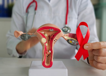 Medical professional holds a red ribbon near a detailed anatomical model of the female reproductive system in a clinical setting