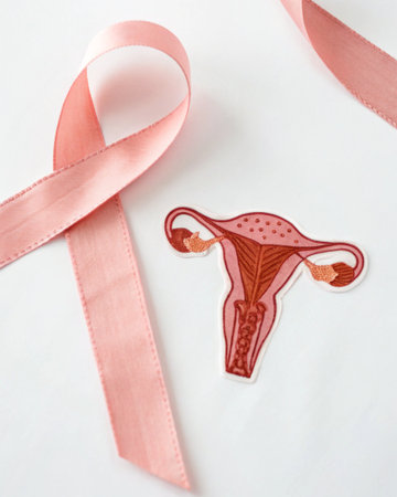 Female reproductive system and breast cancer awareness ribbon on white background, closeup