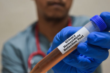 Text Urinary Hemosiderin Detection Test of is written on a bottle sample with background of a doctor with a medical glove mask. Medical concept