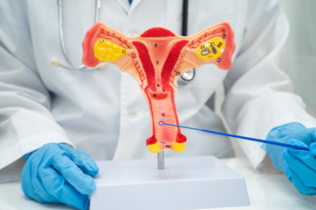 Detailed model of female reproductive system shown by a healthcare professional in a clinical setting