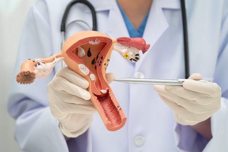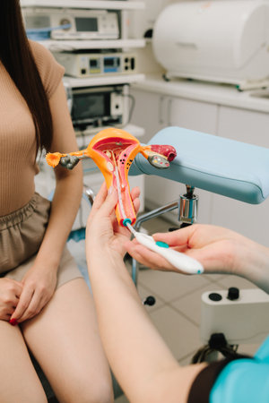 Gynecologist explains reproductive system using an anatomical uterus model during a medical consultation. Gynecological visit educates women about fertility, health, and prevention