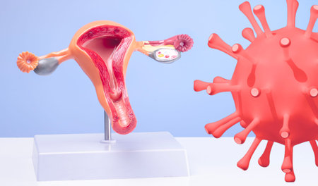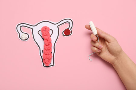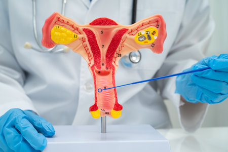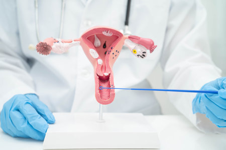 A detailed anatomical model displays the uterus, fallopian tubes, and ovaries, presented against a neutral background.