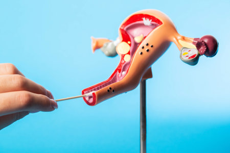 Detailed model of the female reproductive system shown with emphasis on ovarian cysts and health examination