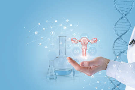 Holding an uterus organ with ovaries in the hands, female reproductive system, pregnancy and gynecological concept, diseases like cancer and polycystic