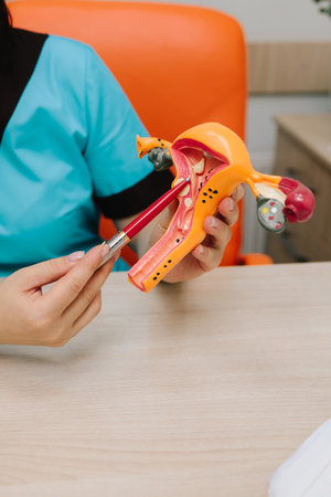Woman gynecologist demonstrating model of female reproductive system in medical clinic.