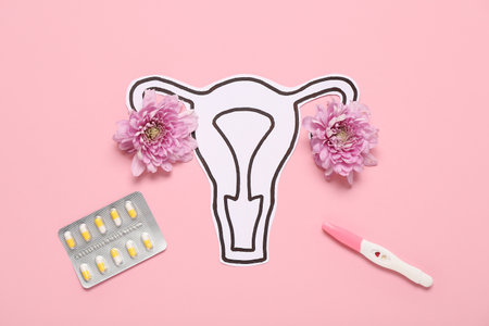 Paper uterus with chrysanthemum flowers, pregnancy test and pills on pink background
