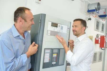 Men looking at electrical equipment