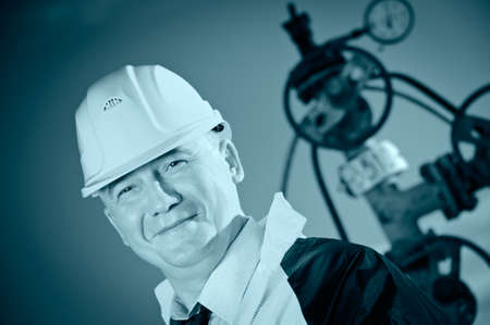 Worker in uniform and helmet on of background the valves, piping and sky. Look into the camera. Toned.