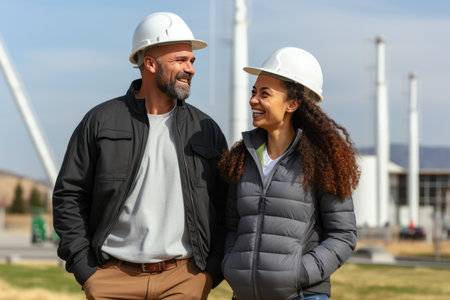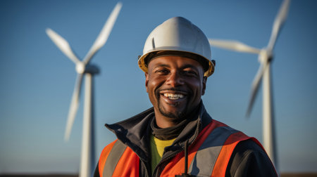 Engineer smiling at wind farm dedicated to renewable energy advances