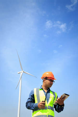 Professional engineer inspects turbine winds using digital tablet and safety gear.