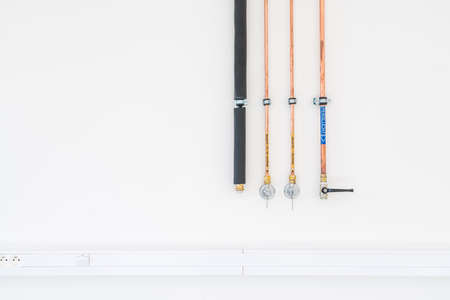 pipe system, red pipe system attached on wall building