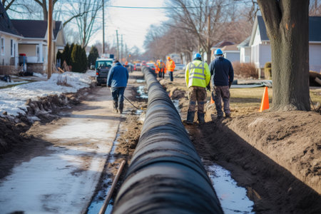Winter construction laying urban water pipes in a small rural town with snowy landscapes