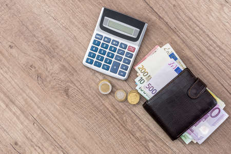 euro in purse with calculator and coin on desk.