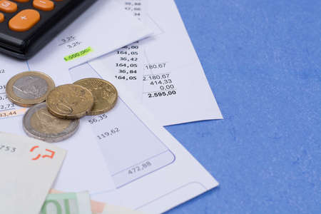 Utility or mortgage bills, calculator and Euro banknote and coins - finance concept, payments and problems