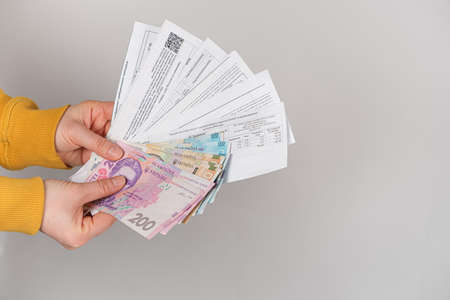 Hryvnia banknotes and payments for utilities are in the hands of a person. Payment for gas, electricity and water in Ukraine.
